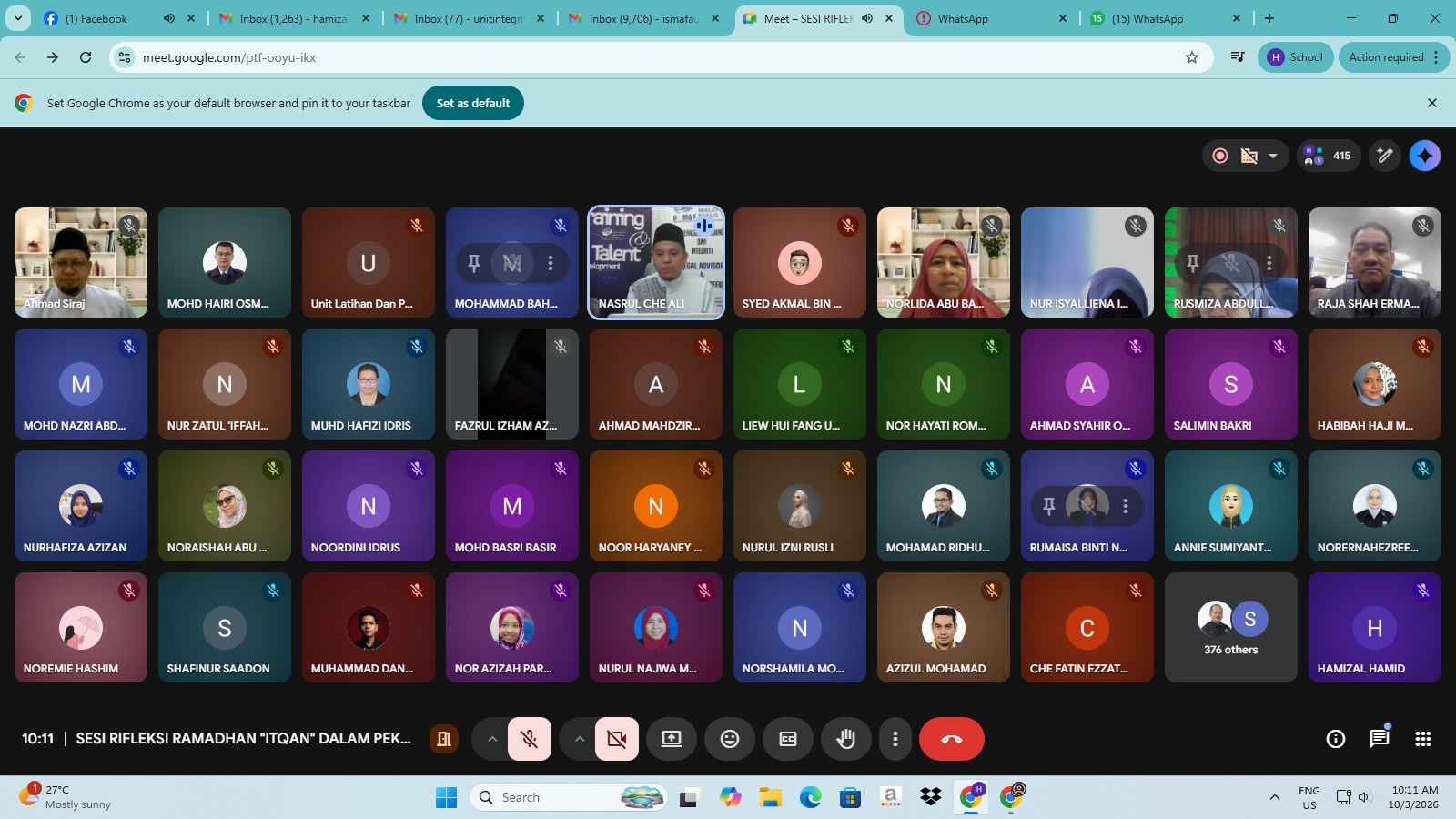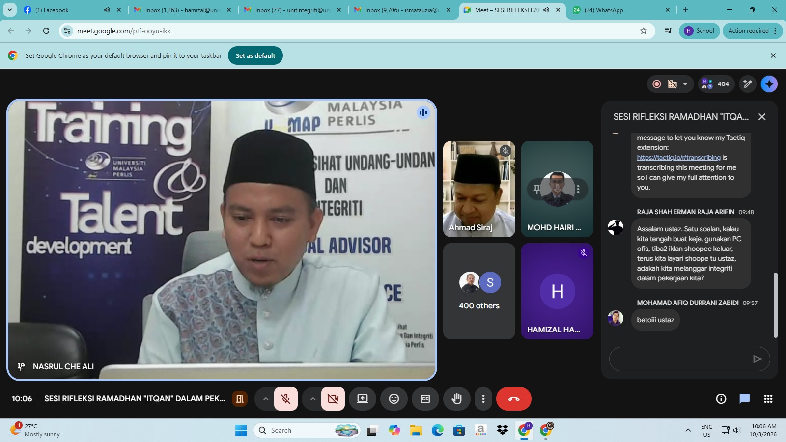 Program bertemakan "ITQAN DALAM PEKERJAAN: INTEGRITI MELAMPAUI PENGAWASAN MANUSIA" ini bertujuan mengupas konsep itqan (ketekunan, ketelitian, dan kesungguhan) dalam melaksanakan amanah serta tanggungjawab.